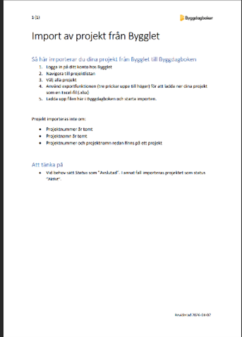 Nu kan du importera dina projekt från Bygglet direkt in i Byggdagboken. Vi har även publicerat en steg-för-steg-guide som visar hur du exporterar Excel-filen från Bygglet för att komma igång så smidigt som möjligt.