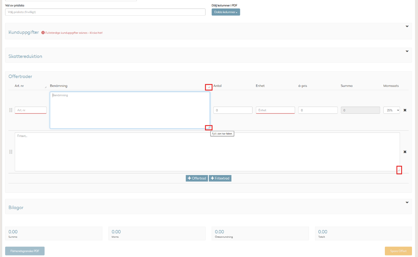 Nu kan du förstora fälten för benämning och fritext, så att du lättare ser vad du skriver.
